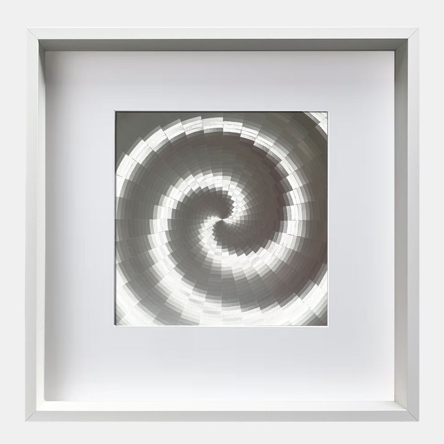 Barbara Lüdinghausen's magnificent Helios Graphics are crafted using metallic foil, often incorporating holographic elements. This technique produces tonal gradients that subtly change with varying light conditions, creating a dynamic visual experience.